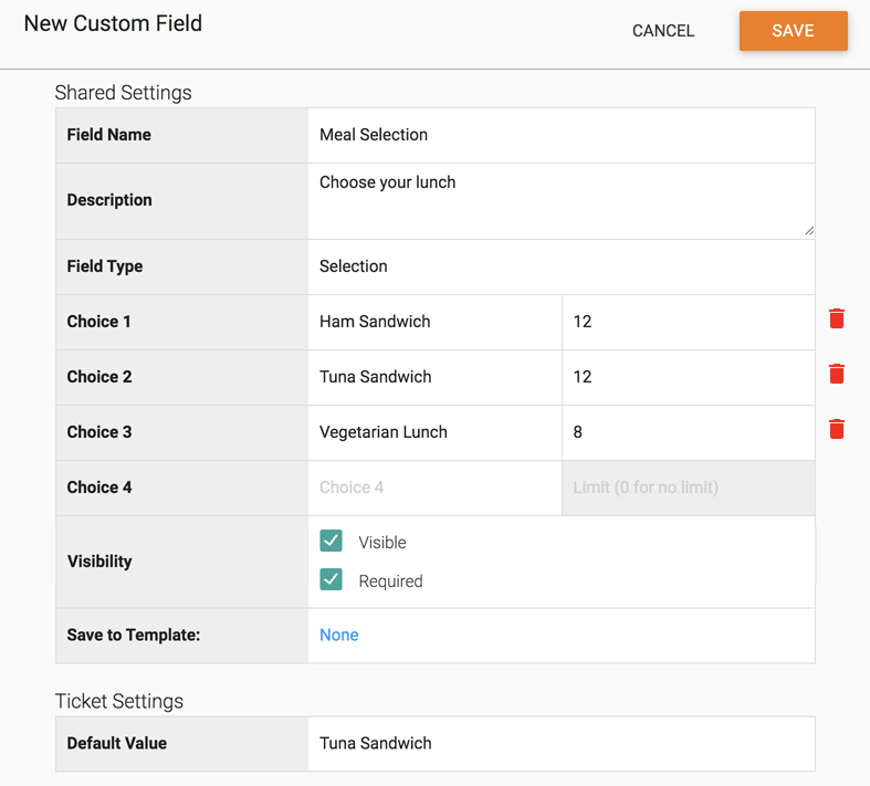 - You can include basic inventory for Selections. Each time a customer selects an option, the available total is reduced by one. When an option reaches zero, it will no longer be selectable by the ticket purchaser.
